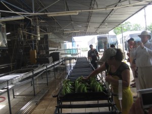 We arrived, eventually, at the Dole Bananito Factory and Village. Bananito means little banana. We calculated that they have a target to process about 2 million bananas a day – 500,000 per container, 4 containers per day. And yes, when I say container, I mean a shipping container. Having seen the process, all gloves and masks and Tesco minimum requirements (no, really)(apparently they are the toughest standards in the world) for crèches and pay, we were then taken to the purpose-built village that they live in. Bananas are an ideal crop for the money-minded. One plant can give you bananas for over thirty years, without the need to reap or replant or anything. Just a bit of fertiliser and people to pick and pack. 42lb of bananas go in one box and then the boxes go onto pallets and the pallets go into the container. They weren’t picking or packing today, because there was no ship in port waiting to be filled.