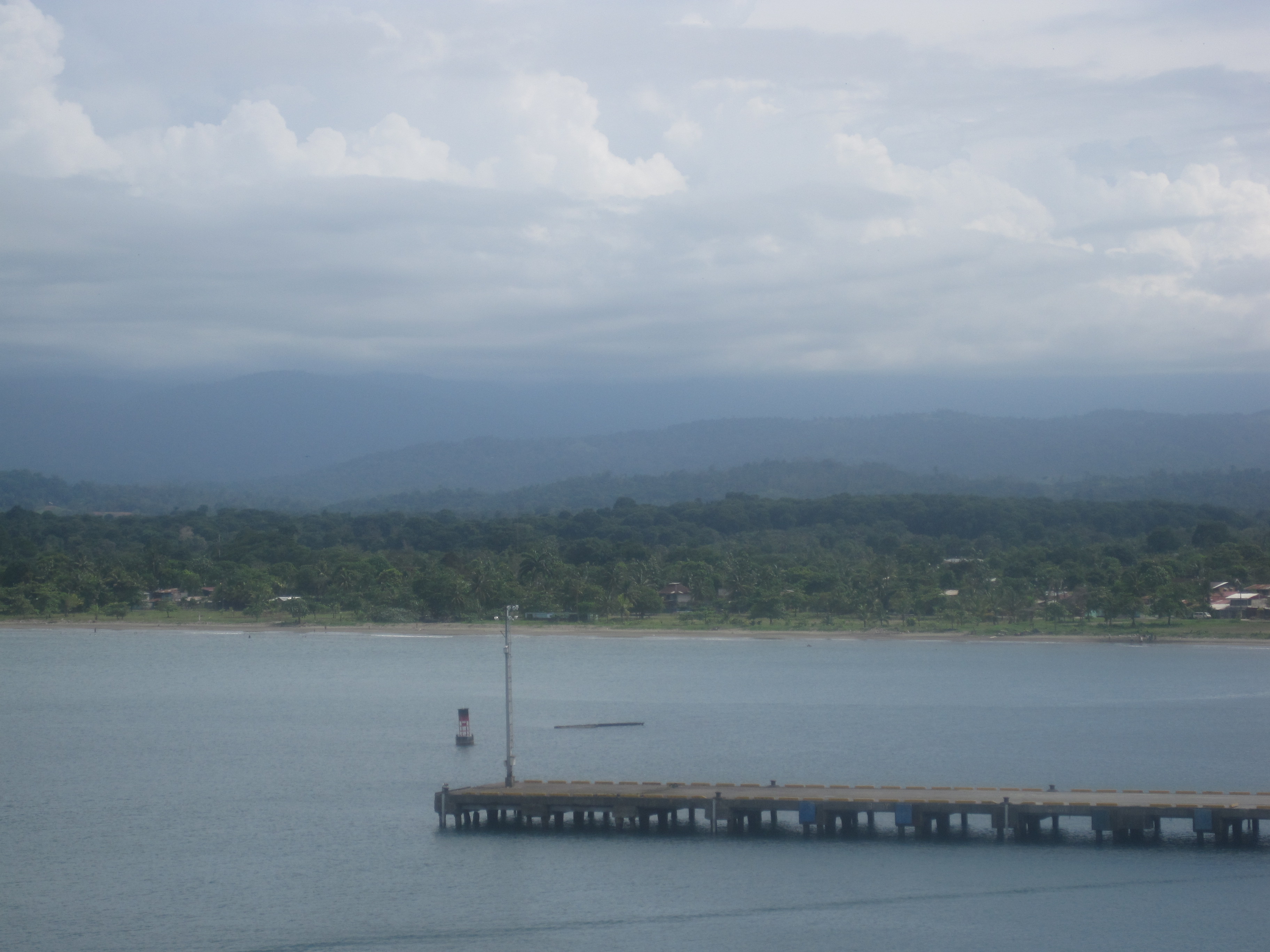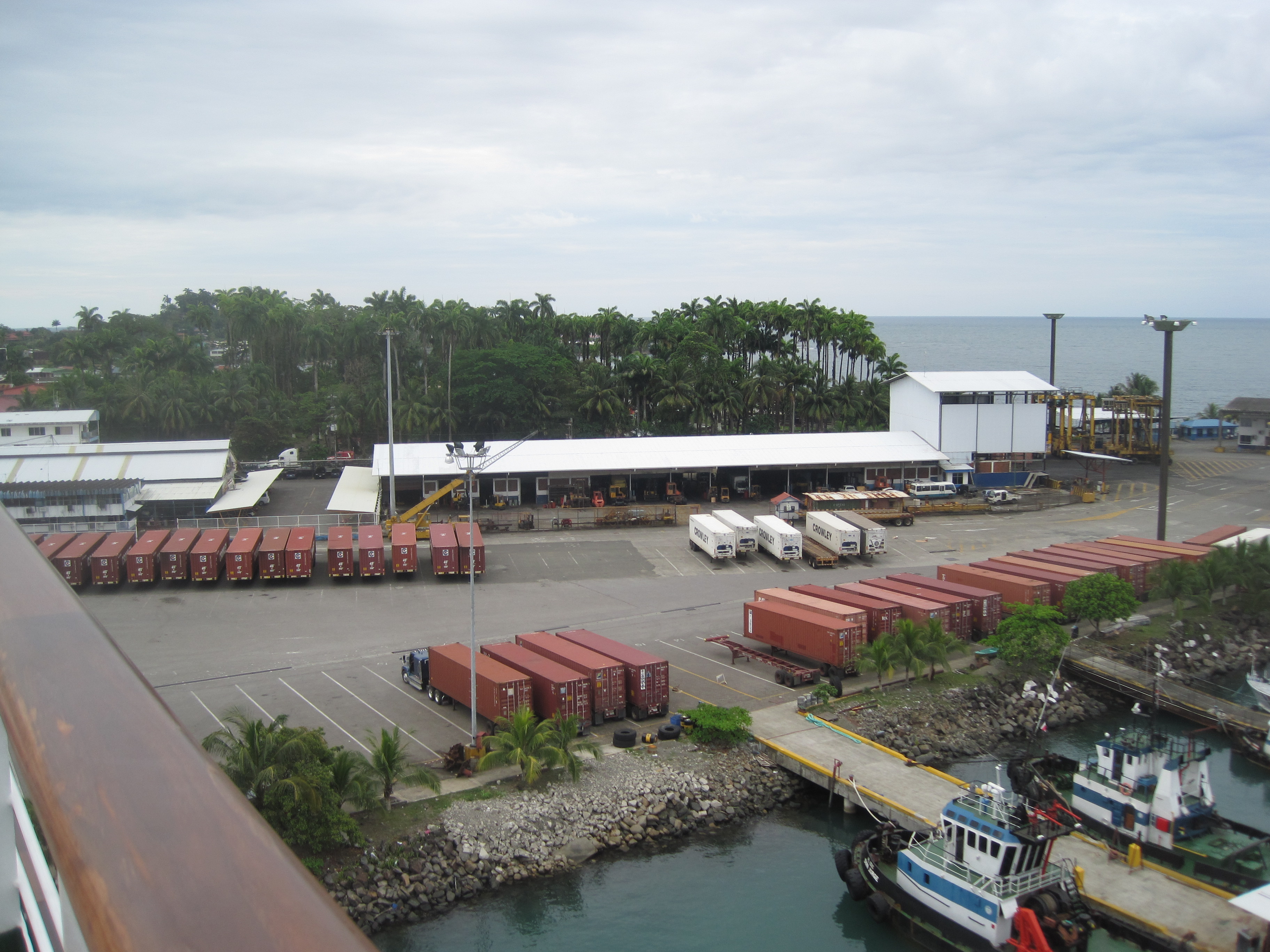 Ah, goody. Another container port to add to my book. Puerto Limon is not very pretty, but then again, I didn’t really expect it to be. Don’t get me wrong. The sea is pretty and we are obviously in quite a sheltered bay, because there are no waves to speak off, even on the opposite shore, and the beaches beyond the port are deserted and look rather inviting. But Puerto Limon itself is a port, a working port, with boxes of things and containers and cranes and forklifts and all the usual accoutrements that combine to concrete over the pretty and replace it with functional but ugly. And, as always in these places, there is one pickup truck that just seems to drive up and down, apparently at random, and without an evident aim or destination. There was one at the Canal yesterday, doing just the same thing.